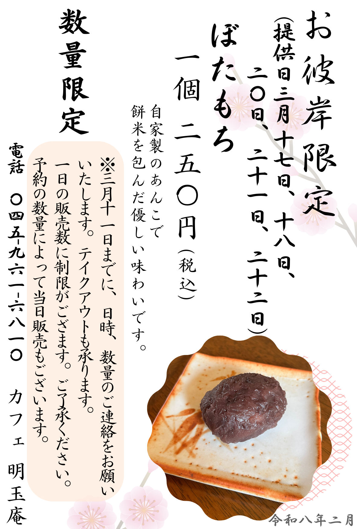☆お彼岸(17,18,20,21,22日)ぼたもちを提供(予約制)いたします!